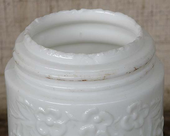 Closure: correct original metal screw band and correct original white milk glass insert with embossed starburst figure