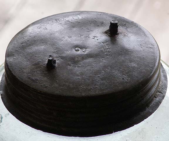 Closure: rare original unlined brass cap with 2 vertical iron lugs on top, and impressed 1857 patent date