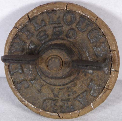 An extremely rare original cast iron Willoughby stopple with raised lettering. Tiny size with the bottom plate measuring about 1-3/4 inches in diameter, and the original gasket measuring 2 inches across. Untouched condition and in full working order. One of two known examples in this size. Fits several early jars such as a quart or pint THE LADIES FAVORITE, pint Wm H HALLER, pint BALTIMORE GLASS WORKS, and many early unmarked stopper jars.