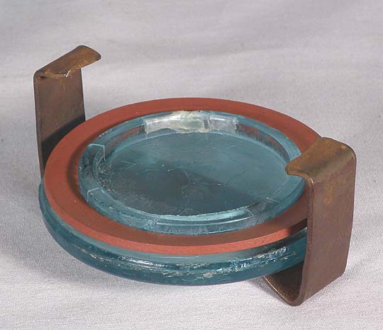 Closure: rare original matching color glass lid (bruise on bottom collar) and a reproduction metal clamp